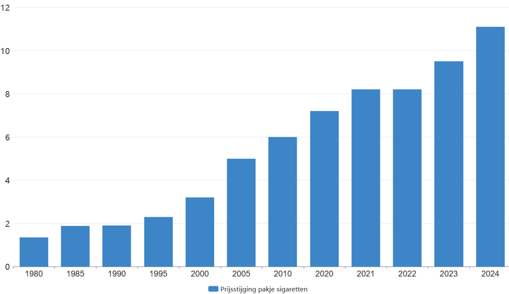 Zoals gezegd is de prijs van een pakje sigaretten en shag afgelopen jaren flink gestegen. In de tabel hieronder is de prijsstijging te zien. Wanneer we kijken naar de toekomstige plannen van de overheid kan er worden gezegd dat de prijzen komende jaren nog verder zullen stijgen. Dit wordt gedaan om het roken te ontmoedigen. Het doel van de overheid is dat er in 2040 een rookvrije generatie is. Dit betekent dat deze generatie opgroeit zonder de schadelijke gevolgen van (mee)roken en vrij zijn van de verleiding om te gaan roken.