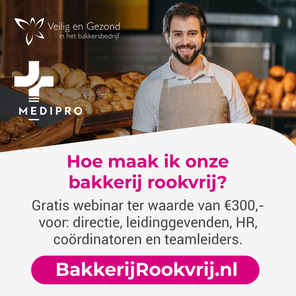 Veilig en Gezond in het bakkersbedrijf biedt in samenwerking met Medipro een gratis webinar aan om je bakkerij rookvrij te maken. Het webinar is bedoeld voor directie, leidinggevenden, HR verantwoordelijken/coördinatoren en teamleiders. Je leert hier hoe je je medewerkers kan helpen bij het stoppen met roken. Ons doel is om samen te werken aan een rookvrije werkomgeving, wat bijdraagt aan een gezondere en productievere werkplek.